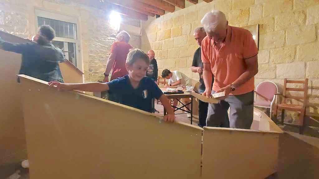 Relève également assurée par le trés assidu petit fils de Jean-Dag concentré sur la préparation des loquets de fermeture (tee shirt blanc).