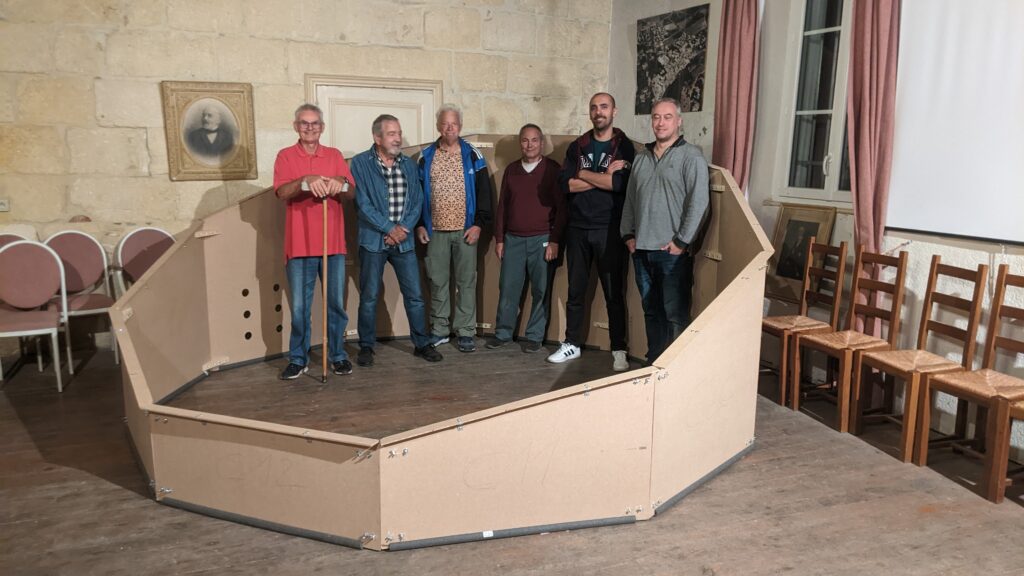 Fabrice, Jean-Dag, Jean-Pierre, Jérémy, Juan, Patrice et moi étions à la salle de l’ancien Conseil Municipal de Langlade pour cette douzième soirée de montage du mini planétarium.