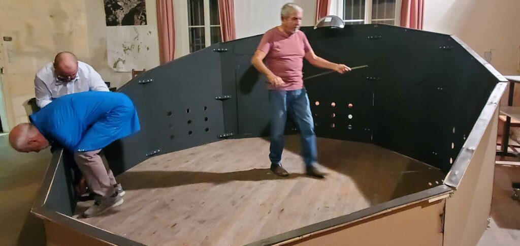 Arrivé en retard (c’était prévu) pour cette quatorzième soirée de travail sur le planétarium, je fus bien accueilli par les huit membres présents à savoir Sophie, Denis, Fabrice, Jean-Dag et son petit-fils Souhayl, Jean-Pierre, Jérémy et Juan car mes bras étaient bien chargés; “il m’a fallu pousser la porte avec les pieds !”. Pour cette soirée, les objectifs étaient de finir la peinture du dôme, de monter la base avec tous les renforts. Comme toujours les différentes actions se font dans une bonne ambiance et je remarquais toutefois pour cette fois beaucoup de concentration.