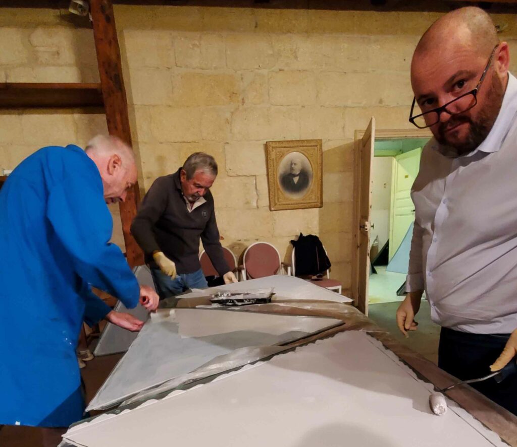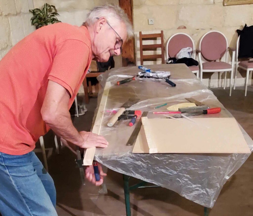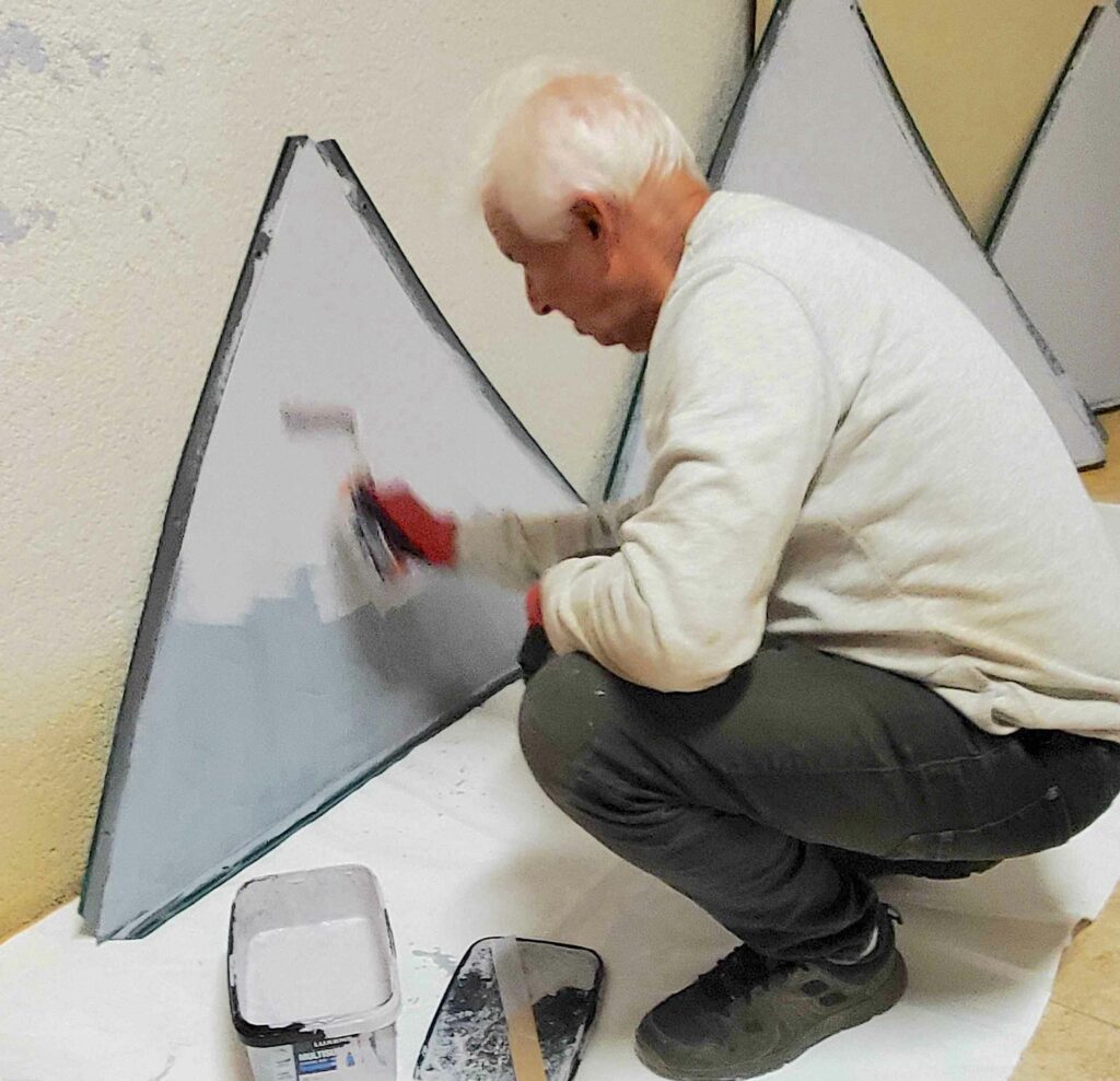 Pour les triangles du dôme, ceux sont Denis, Fabrice, Jean-Pierre et Juan s’y sont attelés. La mise en teinte est presque terminée, il reste toutefois une dizaine d’éléments à peindre. Une seconde couche sera peut-être nécessaire, la décision sera prise à la vue des résultats après un bon séchage.