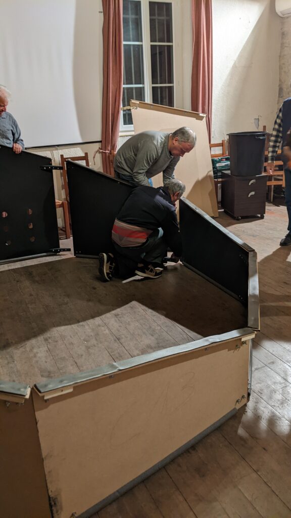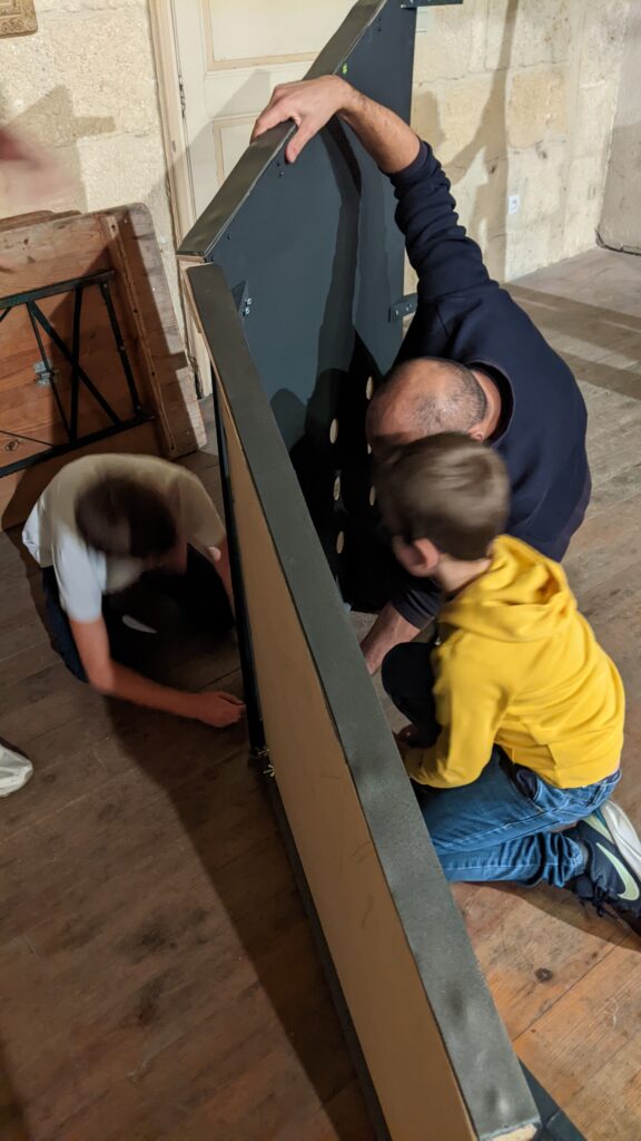 Les dimensions de la salle étant à peine suffisantes pour nous permettre de travailler avec de la surface libre, nous nous sommes organisés en dégageant l’espace, afin de monter le support dans un coin de la salle. En 25 minutes, le support fut monté, sans grandes difficultés.