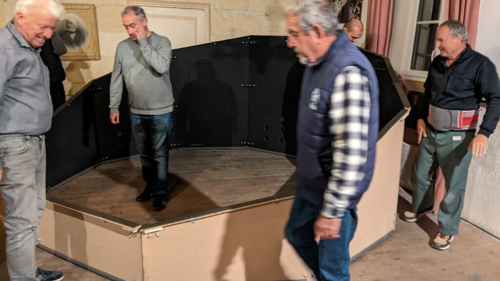 Enfin, le but étant là, nous nous sommes tous placés autour du dôme et l’avons porté avec ces cinquante kilos, pour le positionner sur la surface périphérique du support. Bien entendu, il a fallu manœuvrer pour éviter de malmener le lustre rustique qui orne la salle !