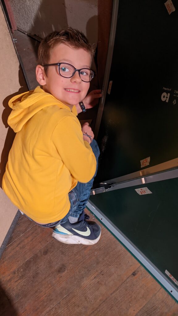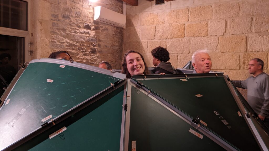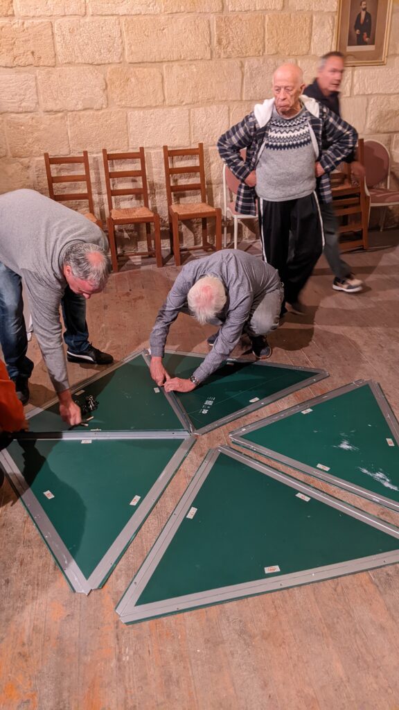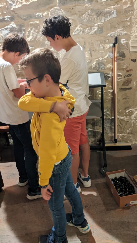 L’équipe des plus jeunes a apporté son renfort en re-étiquetant les triangles : étiquettes blanches pour les triangles “B” (modules pentagonaux) et étiquettes rouges pour les triangles “A” (jonctions). Ces petits détails permettent d’optimiser l’organisation pour les futurs montages.