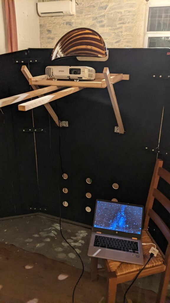 La projection n’a pas donné les résultats attendus sans le dôme mais l’ensemble fonctionne. Peut-être que le miroir sphérique n’est pas assez bombé. Le test en vrai grandeur sous le dôme nous le dira.